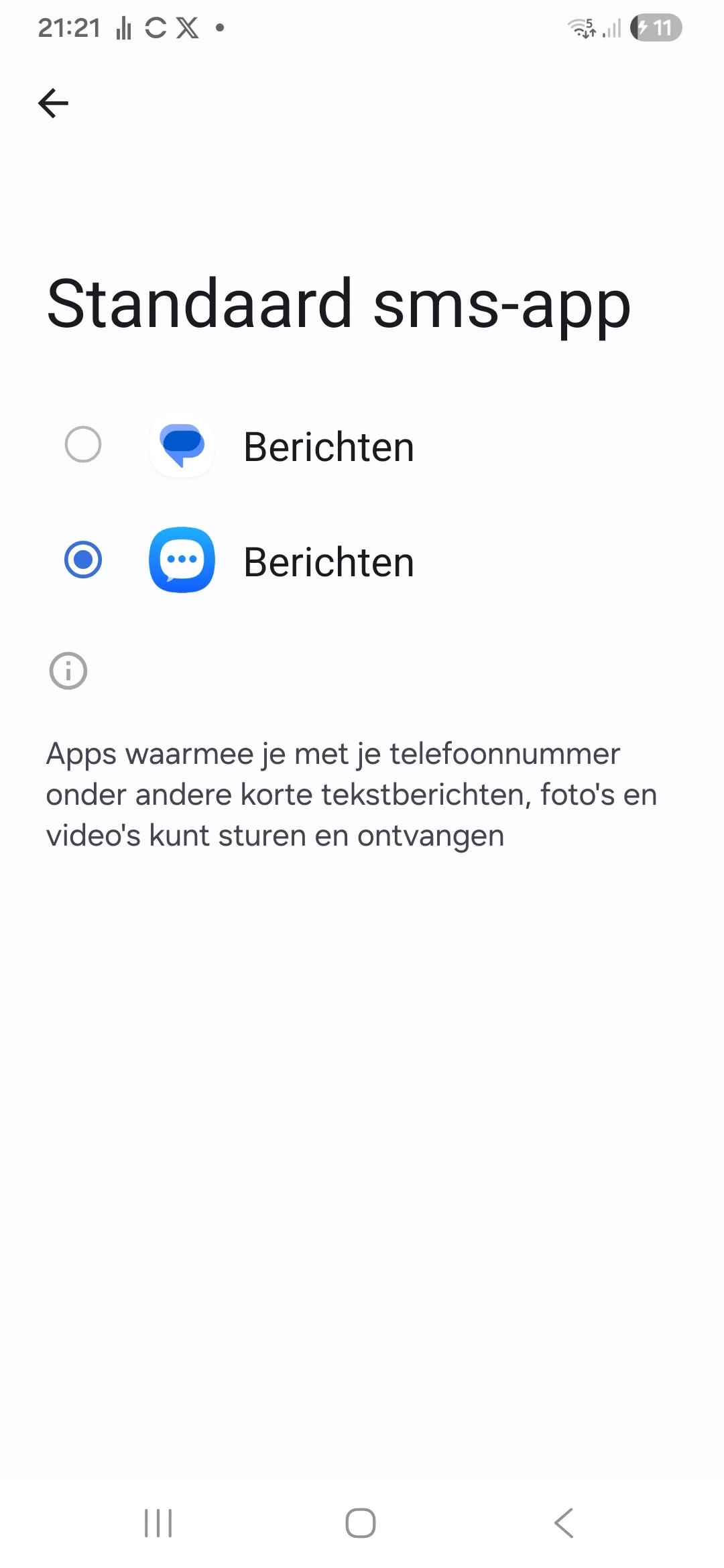 Zo als ik het zie op mijn Samsung.. Je gaat daarvoor naar instellingen, apps, standaard apps, selecteer dan SMS-app berichten zoals in onderstaande screenshot. Het bovenste symbool is van Google messages.