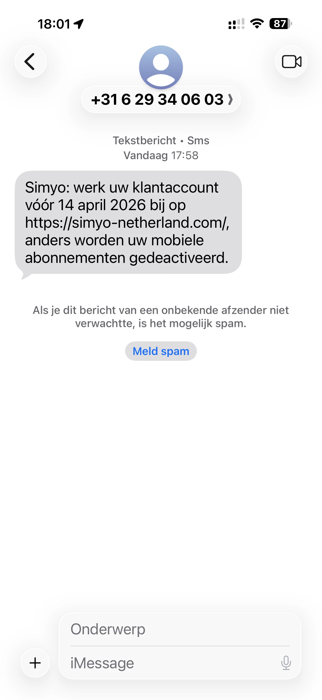 En vandaag de volgende spam sms ontvangen, nu van een voor mij onbekend 06 nummer. Zie screenshot