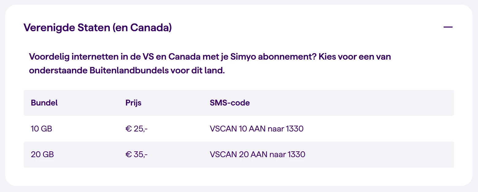 Bedankt voor je bericht. Wij bieden wel een buitenlandbundel aan voor de US (Verenigde Staten). Ik heb even een schermafbeelding gemaakt waar je dit kan terugvinden op de pagina's die je zelf al hebt gedeeld in je bericht: