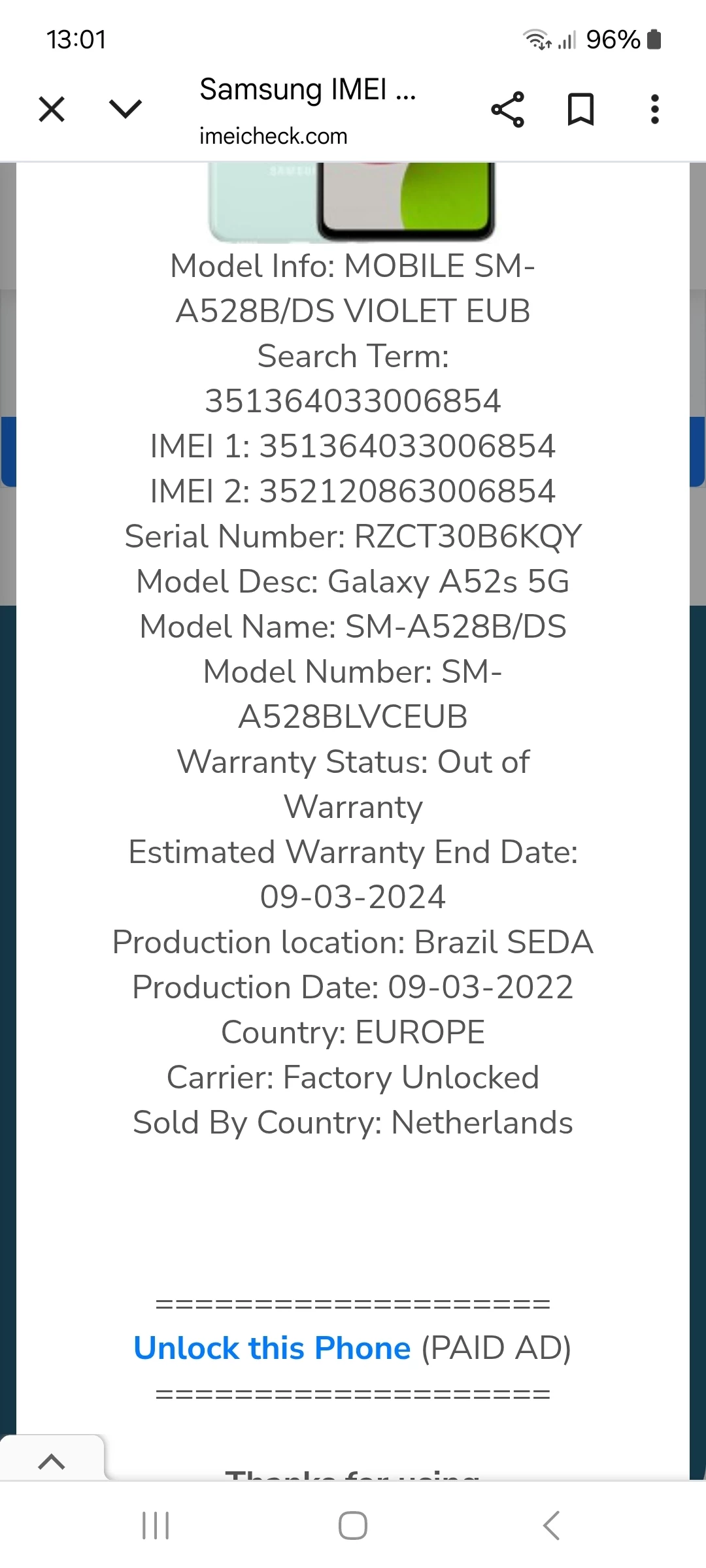 IMEIcheck.com herkent de telefoon. Onderaan button: UNLOCK THIS PHONE ((PAID AD). Durf ik niet op te drukken. Hier thuis geen probleem. Geprobeerd schermafbeelding hier te delen maar lukt niet.