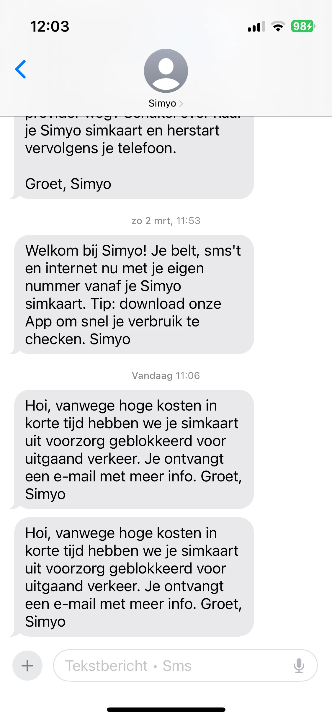 Wij versturen altijd waarschuwingsberichten bij 80% en 100% verbruik van je databundel. Deze sms’jes komen rechtstreeks vanaf het netwerk en zijn altijd leidend. In de laatste sms geven wij ook duidelijk aan wat vanaf dat moment het tarief is (€0.15 per MB) en dat het verstandig is om het internet uit te zetten of een internetbundel bij te kopen. Balen dat je de sms’jes niet op tijd hebt gezien, vanuit Simyo doen wij ons best om onze klanten op tijd te waarschuwen. Als je binnen korte tijd hoge kosten hebt gemaakt buiten je bundel, dan blokkeren wij je simkaart uit voorzorg en sturen wij hier een e-mail over.