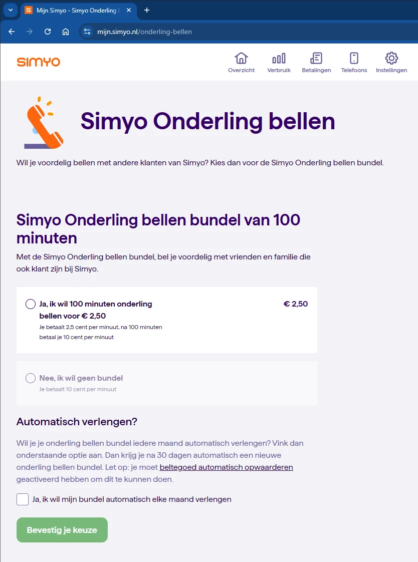 Wil je je onderling bellen bundel iedere maand automatisch verlengen? Vink dan onderstaande optie aan. Dan krijg je na 30 dagen automatisch een nieuwe onderling bellen bundel.
